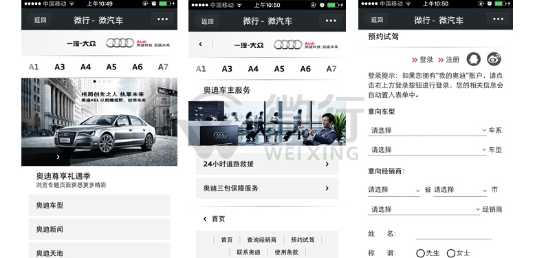 微汽车采用微信平台进行汽车的销售管理、预约保养、预约试驾、保险计算、产品手册、车型配置、车型展示、360度全景看车、销售网点、车主服务等功能,整个过程简单便捷,省心省力,实现商家的销售管理与预约过程,实现客户无需进入4s店就能进行预约保养和预约试驾的功能。